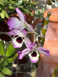 The Camellia House (greenhouse) was built around 1820 for the cultivation of camellias native to China, Japan and Korea, including Camellia japonica and Camellia reticulata. These plants like a shady environment with cool temperatures and humid conditions. Many of these camellias are more than 100 years old, and were in full bloom during our visit. It was such a delight admiring the camellia’s with different shapes and shades of colors – bright red, soft pink, and variegated white & pink. We learned that black and green tea both originate from the Camellia sinensi plant. This greenhouse also has a stunning collection of rare orchids. Some of the orchids come from Australia (ie: dendrobium) and require cool and dry conditions in the winter.
