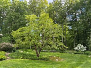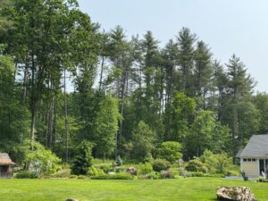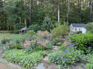 Nan Gustafson’s gardens have been evolving since they moved to Concord in 2006. She notes, over the years, our property has been transformed from mostly forest to a landscape with various outdoor spaces and gardens consisting of a combination of native and non-native trees, shrubs, perennials and groundcovers, which create diverse habitats attracting and supporting a variety of local wildlife throughout the seasons. Flowering Dogwood, River Birch, Serviceberry, Carolina Silverbell, Fringe Tree, Sourwood, Magnolia trees create a transition from the bordering tall White Pines and Oaks. Stone paths meander through woodland and sunny perennial gardens filled with a variety of blueberry, Viburnum, Andromeda, Magnolia, Hydrangea, Witch Hazel, Fothergilla, Lilac and Azalea. Nepeta, Iris, Columbine, Sedum, Rudbeckia, Chrysogonum, Agastache, Penstimum, Echinecia, Hellebore, Astilbe, Coral Bells, Geranium, Anemone, Trumpet Honeysuckle, Vancouveria, Tiarella, Bloodroot are some of the perennials we have growing. Deer have been a growing issue over the years and last year we finally succumbed and installed a permanent fence around the back portion of our property. It was exciting to see phlox, hydrangea, and lilies flowering without being chomped. We are looking forward to being able to incorporate new non-deer resistant plants in our gardens.